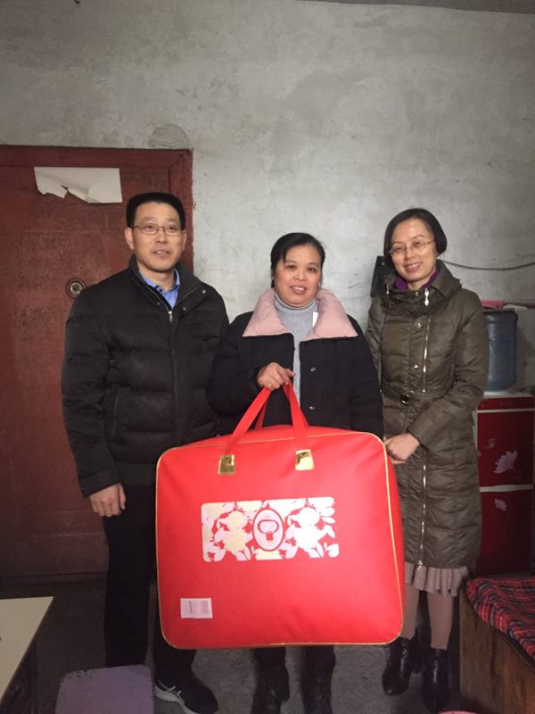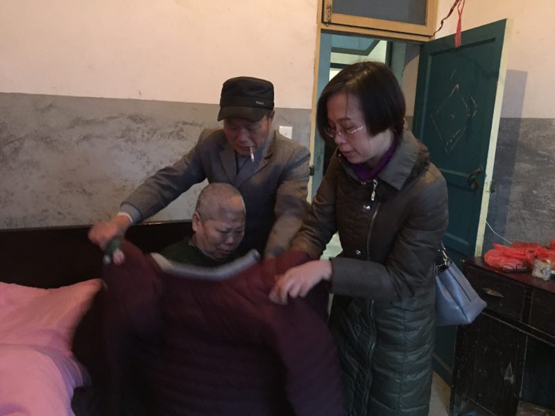 因我市遭遇低温寒冷空气,气温持续下降至零摄氏度。温振宇和李蔚精心挑选了棉被、羽绒服等御寒物品,送到村民下村镇贫困村民邱小梅家中,鼓励她要有脱贫的信心。随后,温振宇和李蔚二人来到贫困户付金根的家中,了解到其因妻子脑卒中后右侧肢体截瘫,卧床已两年的情况后。温振华、李蔚利用自己的专业知识教给付金根一些简单的康复训练手法,以帮助其患病的妻子早日康复。最后李蔚还将病床上付金根的爱人扶起,为老人穿上新买的棉衣,老人流下感动的泪水。