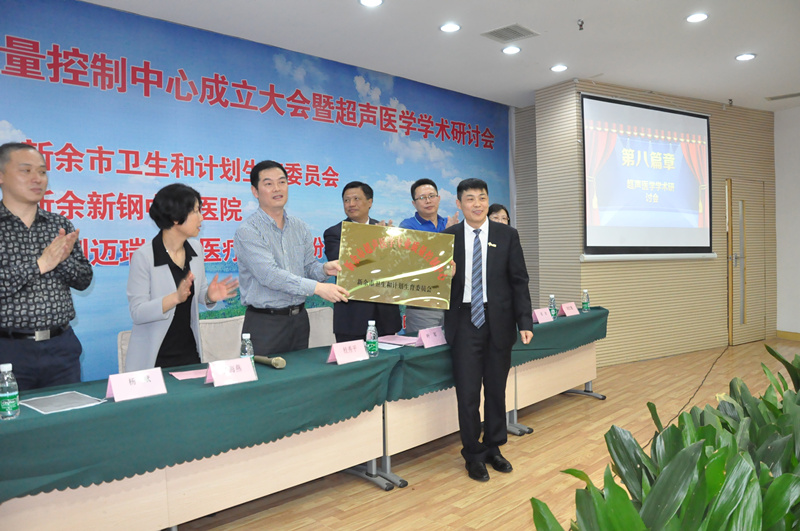 大会在我院医务科邱景平科长的主持下进行。市卫计委医政医管科长杨斌宣读质控中心成立文件,宣布新余市超声医学质控中心设立在新余市新钢中心医院。任命我院超声科主任刘红敏为中心主任;市高新区社会发展部刘志强副局长、市人民医院超声科主任王颖琦、市妇幼保健院超声科主任张锦秀、市中医院超声科主任胡火英、分宜县人民医院超声科主任丁清华为中心副主任;我院超声科余文芳为中心秘书。并由市卫计委桂秀平副主任向中心授牌。