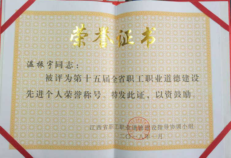 为深入学习贯彻党的十九大精神,大力弘扬劳模精神、工匠精神,营造劳动光荣的社会风尚和精益求精的敬业风气,近日,江西省总工会、江西省职工职业道德建设指导协调小组评选表彰一批全省职工职业道德建设标兵单位、标兵个人和先进集体、先进个人,我院康复科温振宇主任获“第十五届江西省职工职业道德建设先进个人”荣誉称号。