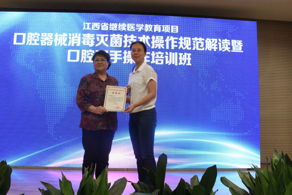 本次培训班邀请了中华护理学会口腔专业委员会主任委员、北京大学口腔医院护理部主任李秀娥;江西省院感质控中心主任罗晓黎;江西省护理学会口腔护理专业委员会主任委员、南昌大学附属口腔医院护理部查春红主任;南昌大学附属口腔医院干保科负责人、特需门诊护士长陈敏进行理论授课和实操培训。《口腔器械消毒灭菌技术操作规范》2017版是国家卫计委颁布的中华人民共和国卫生行业标准,李秀娥主任是这个规范的主要起草人。