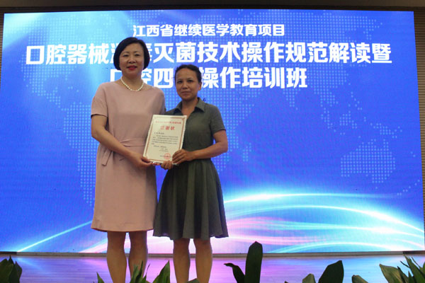 (陈敏护士长进行了口腔四手操作理论及实操培训,新钢中心医院口腔科护士长周群为陈敏护士长颁发感谢状)