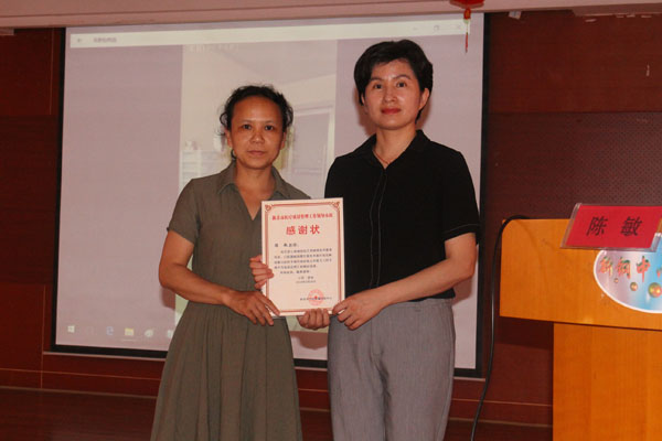 (罗晓黎主任讲授了医院水源性感染的现状和预防控制措施,新钢中心医院口腔科主任助理昝昊为罗晓黎主任颁发感谢状)