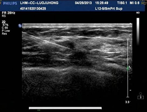 患者女性,43岁,因常规B超体检时左乳房发现一小结节,触诊不清。经高频彩超扫描后,发现有大小约5*6mm的小结节,根据乳腺影像报告和数据系统(BI-RADS)为4类。由于结节小、手诊未能触及,给外科手术切除带来一定的困难。为能更好的满足患者的健康和心理要求,更加精准定位结节,引导手术医师能完整切除肿物而保留正常乳腺组织,超声科主任刘红敏与患者充分沟通后,决定为其实施高频彩超引导下置入乳腺定位针定位联合体表标志切除小结节。功夫不负有心人,手术用时30分钟,成功为患者切除了大小为5*6mm的小结节,经病理化验后确诊为乳腺腺癌。