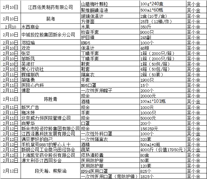 截止2月10日8点至2月12日下午6点,我院陆续收到社会各界直接捐助款共计227259元,各种医用、后勤保障物资共计157879 件。现将我院目前接受到的捐赠款物明细予以公示,接受社会各界监督。