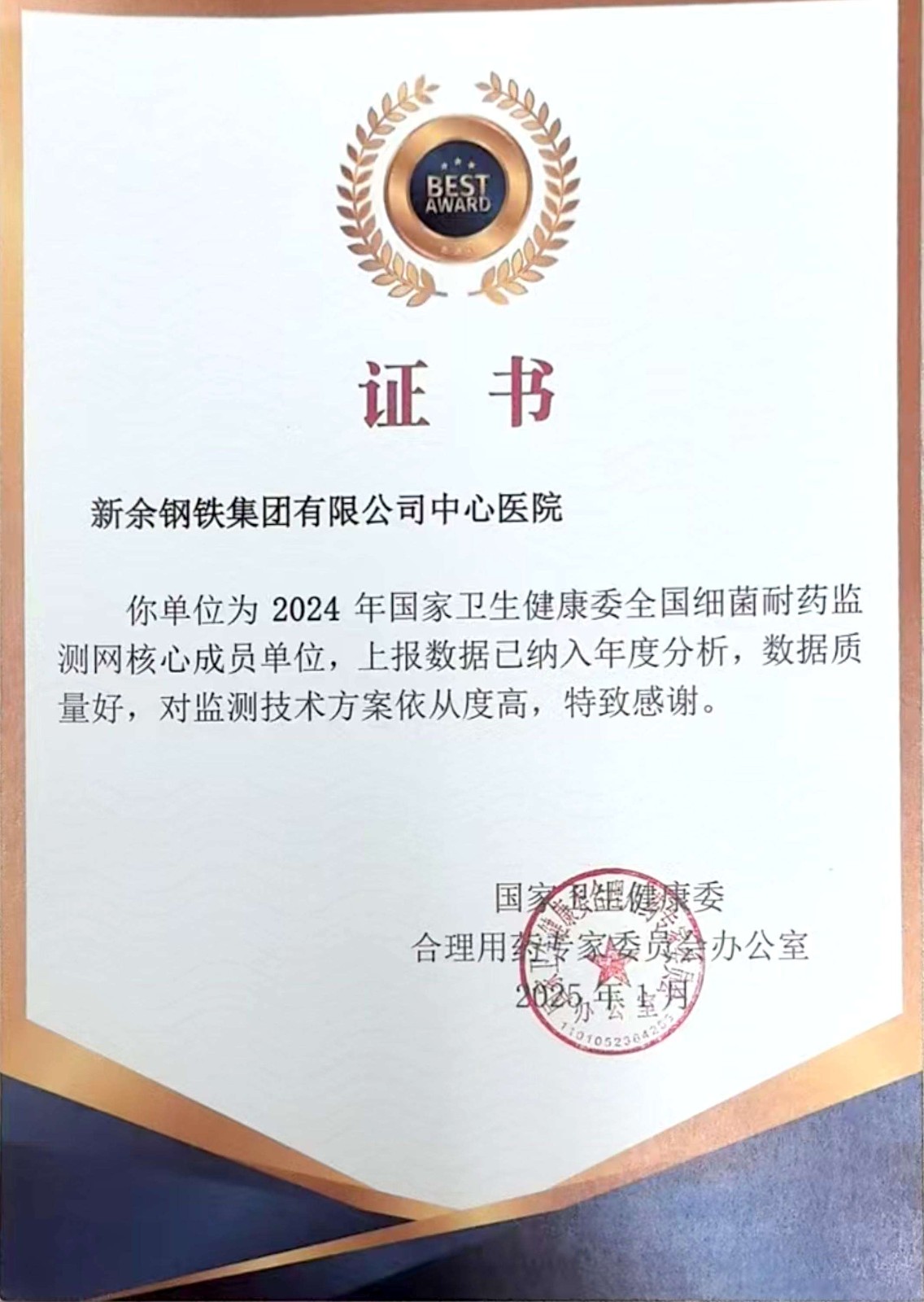此次获评,是对新钢中心医院医疗质量精细化管理成果的充分肯定。接下来,医院将继续筑牢数据质量根基,推动抗菌药物合理使用,为守护区域民众健康构筑更坚实的防线。