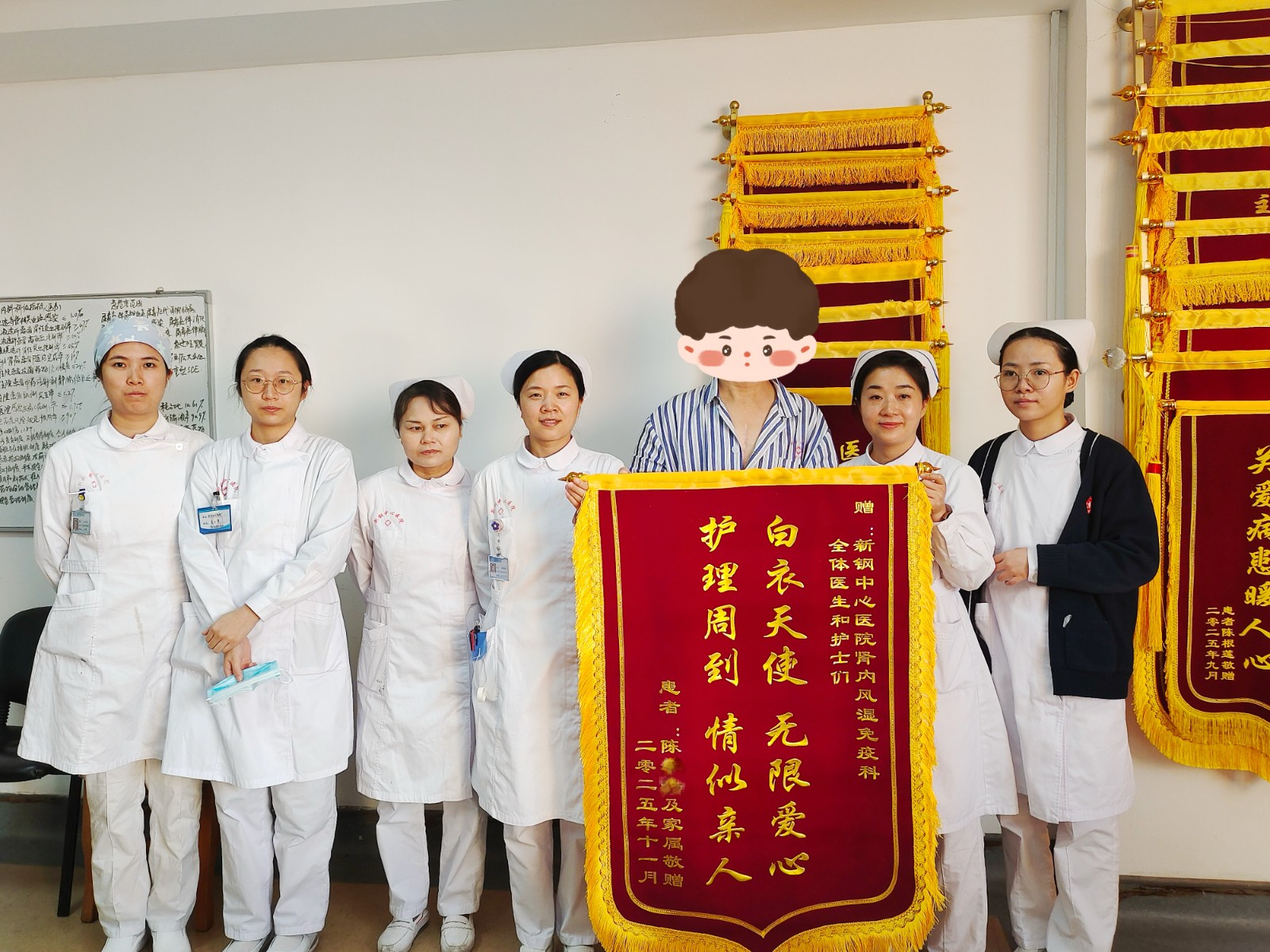 在新钢中心医院肾内风湿免疫科的医护办公室里,一股无声的暖意静静流淌。患者陈先生双手托着一面鲜艳的锦旗,郑重地交到科室医护人员手中。锦旗上,“情系患者如亲人,服务一流暖人心”十四个金黄的大字,仿佛映照着他眼中闪烁的感激。陈先生长期被痛风折磨,因未能规范治疗,足部皮肤逐渐溃烂,还伴有持续高热和消化道出血。本就脆弱的心脏,让他的病情一度雪上加霜,生命亮起红灯。一次偶然的机会,陈先生和家人得知新钢中心医院肾内风湿免疫科在痛风及相关并发症诊治方面经验丰富,便来求助。科室刘镇主任接诊后,立即进行全面评估,并安排陈先生住院,由肖景医师主要负责后续治疗。从此,每天的换药成了医患之间温暖的仪式。肖景医师俯身仔细为陈先生清洁创面、更换敷料,每一个动作都轻柔到极致。从温水的缓缓冲洗,到坏死组织的耐心清理,再到药物的精准涂抹与绷带的仔细包扎,每一个细节里都藏着医护人员的专注与温情。时间在无声中流逝,他们却始终如一,用专业与细致,一点点为愈合铺路。在日复一日的精心照料下,陈先生足部的伤口渐渐结痂、长出新肉,他的脚步也一天比一天轻快。提起这段经历,他语气里满是动容:“真的多亏了他们,不只是治病,更像家人一样关心我,心里特别暖!”这一切,患者和家属都默默记在心里。他们特意定制了这面锦旗,以最朴实的方式,表达那份难以言说的感谢。锦旗虽轻,却承载着生命的托付与信任;言语虽简,却映照着医者仁心的温度与光芒。