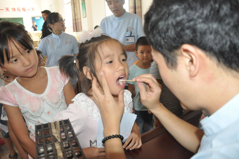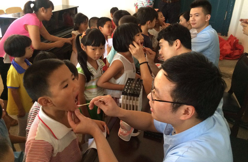 下午两点,口腔医师带着牙膏、牙刷等礼物准时来到学校,医务人员为该校小学生上了一堂《爱牙护牙知识及正确的刷牙方法》口腔知识课,口腔医师利用图文并茂的PPT课件深深吸引孩子们的眼球,让孩子们在趣味中学习牙齿的保健知识。同时向孩子们发放口腔健康宣教资料200份,赠送牙刷牙膏各100支;并为学生进行口腔健康检查,建立口腔健康档案;免费涂氟保护牙齿等活动,让偏远农村儿童也享受到优质的口腔健康服务,在中秋佳节前夕为留守儿童送去一份特殊的节日礼物。