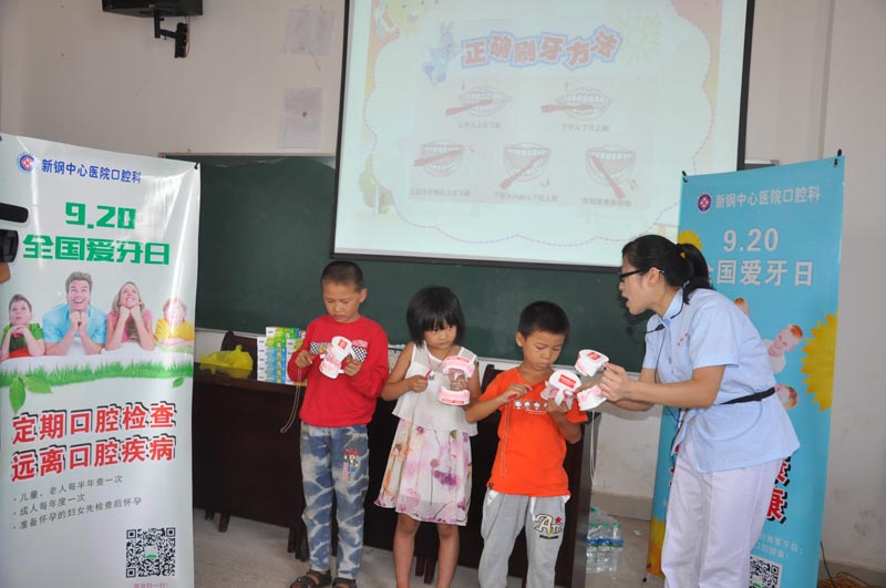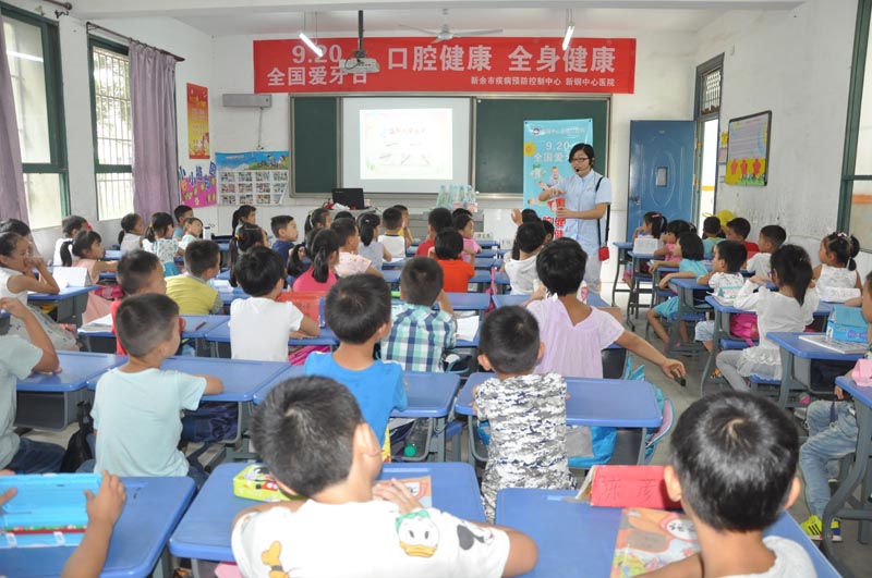 “口腔健康,全身健康”,为迎接第二十八个全国爱牙日的到来,新钢中心医院联合新余市疾控中心分别来到市逸夫小学、马洪乡侨心小学、市图书馆、市倍蕾幼儿园分别开展了一期口腔卫生知识保健课。每一场爱牙知识课堂,新钢中心医院口腔科医务人员以生动活泼的课程内容、口腔模型实物为同学们讲述口腔卫生知识、正确刷牙方式,以及口腔卫生保健的正确方式方法,并结合问答形式与孩子们进行互动。课后,并有序安排了口腔健康检查,并为检查的学生建立口腔档案,发放牙膏牙刷300余支,口腔卫生知识宣传资料500余份。在爱牙日当日,并为50名孩子进行免费涂氟治疗。