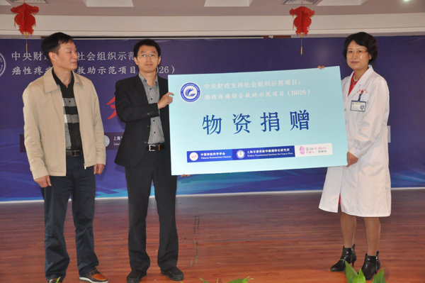 随后,学会向新钢中心医院进行了“国家民政部项目癌症疼痛综合救助点”授牌和抗痛药品、书籍捐赠、志愿者证书颁发仪式。本次活动受到热衷公益、富有社会责任感的北京豪格科技发展有限公司的物资捐赠,随后该公司蔡柳斌总监发表捐赠感言。随着新余市民政局副局长罗振、新余市卫计委主任曹卫红、新余钢铁集团有限公司工会主席刘传伟分别作最后致辞,新余站癌症疼痛综合救助服务正式启动。