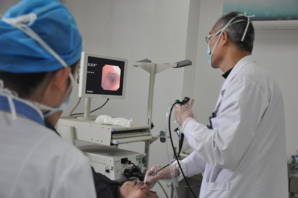 图为呼吸一科张少兴主任医师正在为患者行支气管镜检查