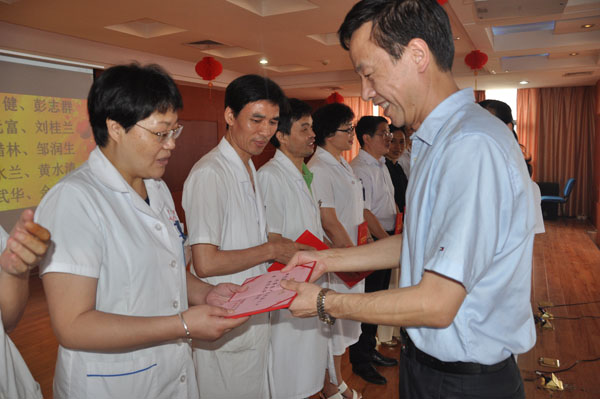 6月26日,新钢中心医院举行2017年第二届医师节表彰大会,医院领导班子、全体100余名医师参加表彰大会。 图为表彰会现场: “我们承诺:平等仁爱。坚守医乃仁术的宗旨和济世救人的使命……”6月26日,医院部分青年医师重温《中国医师宣言》,铿锵有力的誓言久久回荡在多功能厅里,回荡在每位医师的心中。 图为重温《中国医师宣言》: 会上,医院党委书记彭宣读表彰决定,院领导分别向获得“优秀质量管理科室”“优秀科主任”“好医生” 的科室与个人颁发了荣誉证书。并通过生动的视频短片对获奖的科室与个人进行介绍,生动展现出医生在不同岗位上的工作缩影。 彭书记宣读表彰决定: 表彰先进: 在表彰大会的最后,院长李跃程发表重要讲话,他首先向获得表彰的医师表示祝贺,向奋战在临床一线的全体医师们致以最诚挚的节日问候。他强调,医师应当敬畏生命、敬畏病人、敬畏医学,医师不仅仅要掌握技术,还要修身养性,始终不忘从医的初心,并对全体医师提出了殷切的希望和中肯的要求。 李院长发表重要讲话: