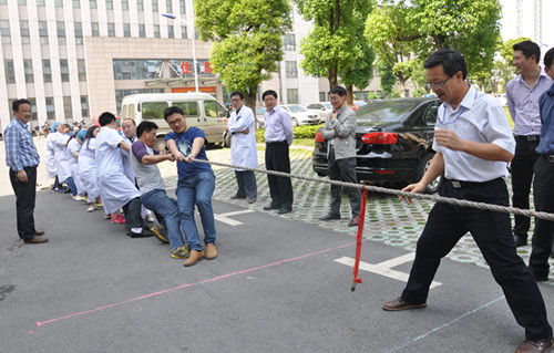 为迎接“五一”劳动节的到来,丰富医务人员的节日文化生活,4月30日下午,院工会举行了一次拔河比赛。比赛以分会为小组,每组选出六名“壮士”和六名“女汉子”。经过激烈角逐,门诊分会小组获得第一名、机关后勤分会小组获得第二名。图为比赛情景: