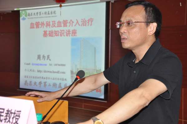 学术会上,周为民教授利用图文并茂的PPT课件,结合他丰富的临床实践经验、采用大量详细的数据及典型病例对《血管外科及血管介入基础知识》进行了详细探讨,内容丰富全面。二附院血管外科的刘强副教授、郑春艳护士长分别就《主动脉瘤的临床诊疗》《前列地尔在血管外科的应用》《深静脉血栓围手术期的护理》知识点进行了讲解。