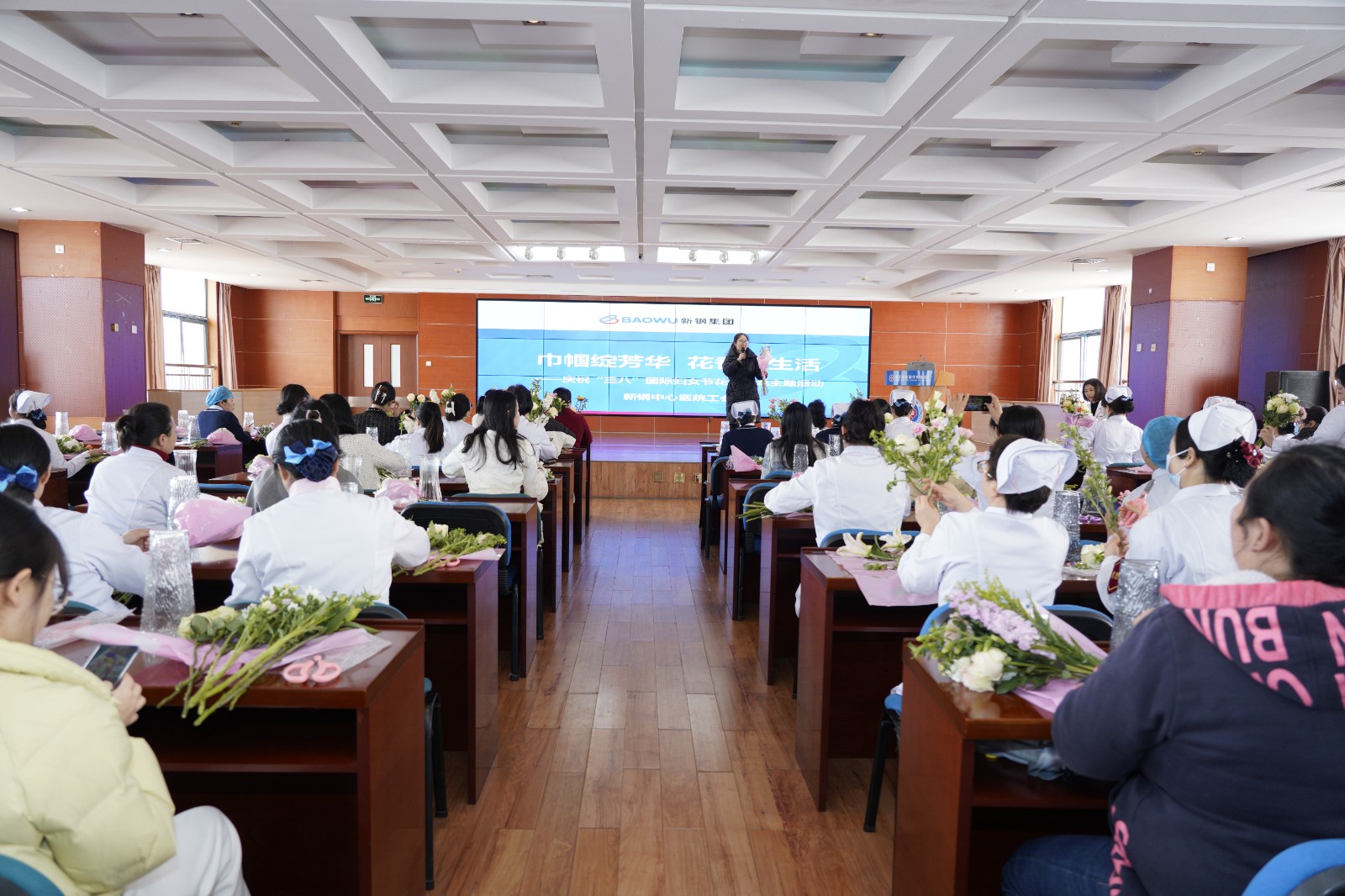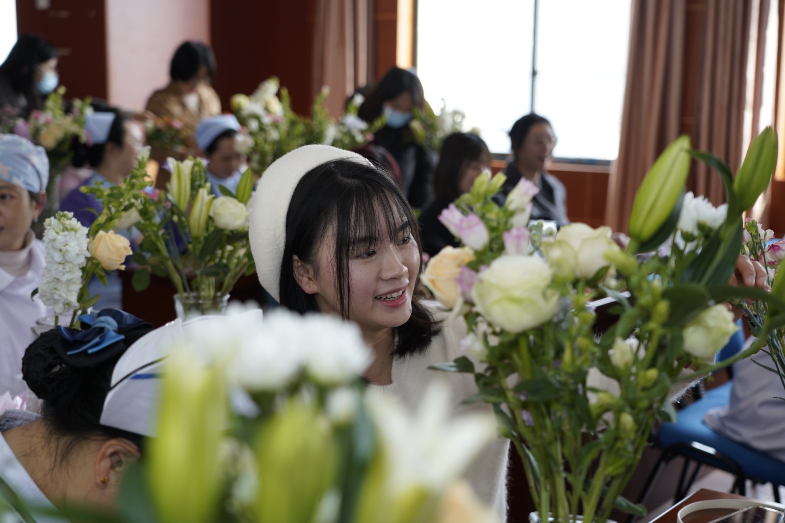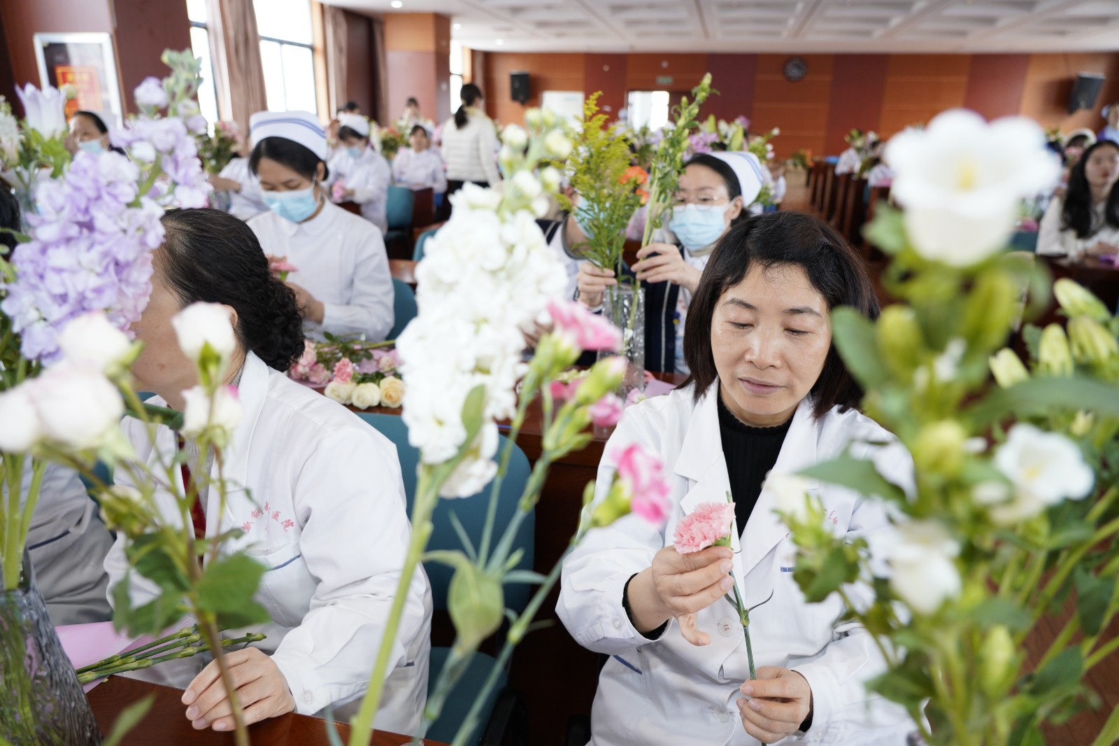 阳春三月,春意盎然。为进一步丰富医院女职工的精神文化生活,弘扬巾帼风采。3月8日下午,院工会举办了主题为“巾帼绽芳华 花香悦生活”插花活动。120余名女职工参加活动。