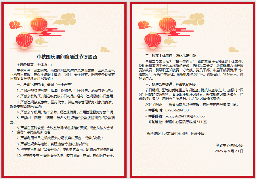 新钢中心医院中秋国庆期间廉洁过节提醒函