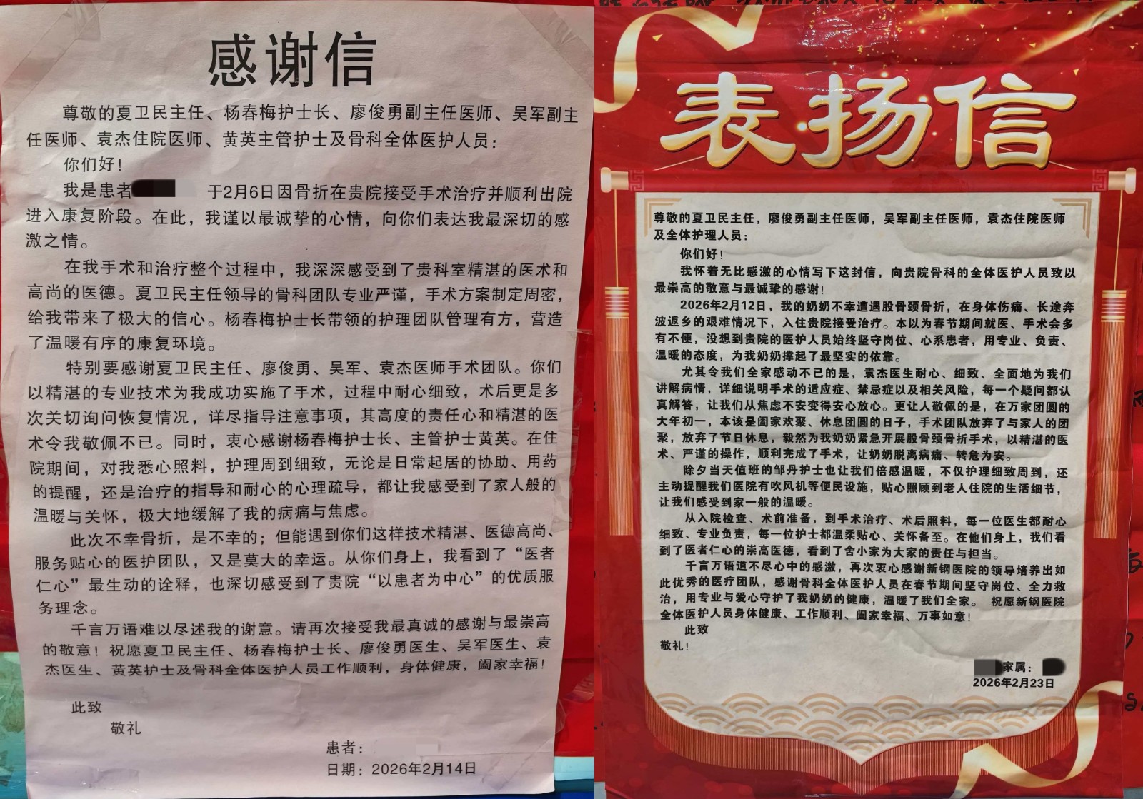 比如摔倒的那一刻,骨头断裂的剧痛让整个世界都失去了颜色。比如看着年迈的亲人被推进手术室,门关上的瞬间,心也跟着悬在了半空。熊阿姨从来没想过,自己会因为一次意外骨折,遇见一群让她终生难忘的人。入院那天,她的心情是灰暗的。疼痛折磨着她,对手术的恐惧也挥之不去。可就在她被推入新钢中心医院骨科病房的那一刻,一个微笑迎了上来,一句“别担心,我们都在”轻轻落在耳边。骨科夏卫民主任带着医生们一次次来到床前,仔细询问、耐心解释,手术方案的每一个细节都被反复推敲。廖俊勇、吴军、袁杰三位医生在手术台上的专注,让熊阿姨即使在麻醉前的那一刻,也能感受到一种踏实的信任。手术很成功,但她更记得的,是术后每一次查房时,那些关切的眼神和细致的叮嘱。而在那些最难熬的日子,是杨春梅护士长和黄英护士一次次来到熊阿姨的床边。她们递来的不只是药片,还有一句句暖心的话,一次次耐心的疏导。在熊阿姨因为疼痛烦躁时,陪着说说话,帮着调整一个舒服的姿势。那些细微的举动,让熊阿姨觉得,自己不是一个人在熬。与此同时,在另一间病房里,小何正守在自己年迈的奶奶身边。奶奶的年纪大了,手术风险也高,小何的心一直悬着。可让他感动的是,从入院检查到术前准备,从手术到术后照料,每一个环节都有人耐心地陪着他们、扶着他们。医生们一遍遍讲解病情,护士们一次次安抚老人的情绪。那些日子里,他看到了医生们伏案研究病案的背影,看到了护士们穿梭在病房里的脚步,也看到了他们偶尔望向窗外时眼中闪过的一丝牵挂。他们也有自己的家人,他们也想回家吃一顿热乎的饭。可在那些阖家团圆的日子里,他们选择守在病房里,守在陌生人身边。小何后来在信里写:“在他们身上,我们看到了医者仁心的崇高医德,看到了舍小家为大家的责任与担当。”熊阿姨出院那天,阳光很好。她回头看了一眼病房的方向,心里涌上一股说不出的情绪。她知道,自己带走的不只是康复的身体,还有一份沉甸甸的感激。在这遇见了一支技术过硬的团队,也遇见了一群温暖的人。在最脆弱、最无助的时候,是这些人用专业和爱,把她从病痛中拉了回来,也让她重新相信,这个世界上,总有人在默默守护着你。两个不同的人,两段不同的经历,却写下了同样的心声: